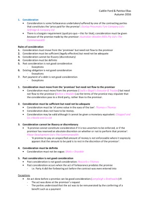 An easy to follow, step-by-step guide to answering final exam problem questions. Topics include: Contract formation Parties to the contract Terms of the contract Matters affecting contractual assent Illegality Discharge/Termination of contract The sample notes provides the CONSIDERATION element of the 'Contract Formation' topic.