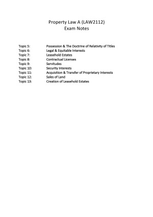 Comprehensive notes for Property Law A (LAW2112) as taught in Semester 1 of 2016. Covers: Topic 5:Possession & The Doctrine of Relativity of Titles Topic 6: Legal & Equitable Interests Topic 7: Leasehold Estates Topic 8: Contractual Licenses Topic 9: Servitudes Topic 10: Security Interests Topic 11: Acquisition & Transfer of Proprietary Interests Topic 12: Sales of Land Topic 13: Creation of Leasehold Estates