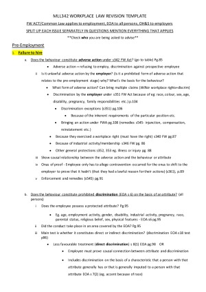 Recently completed workplace law in T2 2016. Managed to condense everything into an exam answer template that's just below 5000 words. It was unbelievably helpful in the MLL342 exam and was pretty much all that was required. It has subheadings for each type of potential question and everything you must go through to answer them. Consulted the unit chair several times and it was methodically written. I received 82 in the subject.
