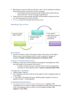 25 Pages of Full Colour Organised Exam Notes for 70616 Australian Constitutional Law. Easy to navigate design created for open-book exam conditions. Complete contents page. Flowchart for answering Constitutional problem questions is included. Covers all examinable content including: - Framework of the Australian Constitution - Separation and Division of Powers - Purposive, Non-Purposive and Implied/Incidental Powers - Application to the States - Application to the Territories - Judicial Powers - Nationhood Power - Defence Power - Trade and Commerce Power - Races Power - External Affairs Power - Trial By Jury - Inconsistency of Laws - Implied Freedom (Political Communication)