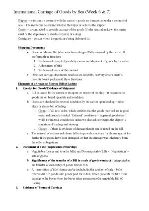 Notes- Structured for the Exam Topics (Weeks 4-11) International Sale of Goods International Carriage of Goods by Sea Marine Insurance International Carriage of Goods by Air Payments in International Sale of Goods Transactions (UPC600) Dispute Resolution Note: the cargo clauses are not included in these notes, and would have to be printed out separately. However, all the relevant articles/sections are in the notes including summaries of the cases related.