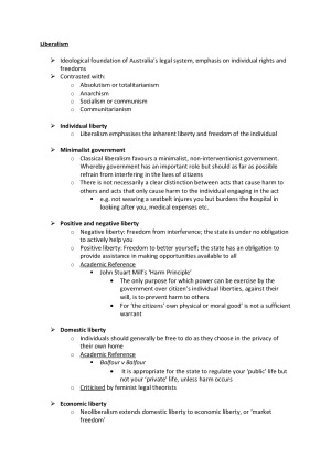 I was among the 4% of the cohort who received a High Distinction for this course and the notes that I compiled for the open book exam at the end of the semester were invaluable. I have organised my notes by including first the desired format of exam answers (1 page), then a short summary of the each of the different ideologies and theoretical frameworks and the for and against arguments to allow me to plan my answers quickly and effectively in perusal time (2 page), and then I have detailed each ideology/framework covered in chronological format (from Lecture 1 – 13). I have included in my notes material from lectures, tutorials, readings and recommended readings as well as arguments the lecture has specified as crucial/worth high marks. Each ideology/framework includes a description, sub-elements, arguments for/against, and academic references.