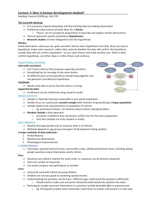 These are my H1 (92) summary lecture and tutorial notes for Mind Brain Behaviour 2. I didn't do MBB1 so I had to do more of my own research! My notes includes in depth explanations for the concepts which I missed in MBB1. Some concepts were also rushed over in lectures/tutorials in MBB2 so my notes have my own research to explain concepts. I've highlighted in different colours the various ways I used to help memorise the million ideas that are covered. I also point out which areas the lectures wanted us to focus on. Because student VIP has an upload limit, I had to split my notes into 2 parts. I had too many words!! haha THIS first part includes notes for: - Human Development - Social Psychology - Research/ Quantitative Methods The second part of my notes (in a separate file) has: - Personality notes - Clinical Psychology notes Thank you! :) And Good luck!