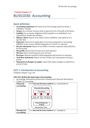 A very organised, comprehensive and easy to understand set of notes! Includes weekly summary of lectures and textbook references. Colour coded and includes visuals to help with your understanding! The notes include sample formatting or step by step rules for laying out the 3 financial statements!