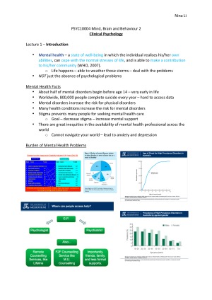 PSYC10004 Clinical Psychology Notes for both lectures and practicals All you need to do well for your exam! These notes are already colour-coded along with diagrams from lectures. They are very clear and easy to read. Everything you need to know about Clinical Psychology for this subject is covered. For clinical psychology, you need to know both what is taught in lectures and in tutorials/practicals. Notes from practicals are also included and provided with diagrams. I only used these notes to revise before exam while having limited time during SWOTVAC. Very useful when you do not have time to go over lectures. This is all you need! Please do not hesitate to also check out other parts of the subjects (Developmental, Social, and Personality) as I also provide them separately!