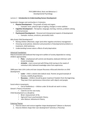 PSYC10004 Developmental Psychology Notes All you need to do well for your exam! These notes are already colour-coded along with diagrams from lectures. They are very clear and easy to read. Everything you need to know about Developmental Psychology for this subject is covered. I only used these notes to revise before exam while having limited time during SWOTVAC. Very useful when you do not have time to go over lectures. This is all you need! Please do not hesitate to also check out other parts of the subjects (Social, Personality, and Clinical) as I also provide them separately!
