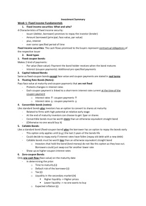 These notes contain examples, definitions and explanations of every concept learnt in Investment. Useful for midsem exams (which I got full marks), final exams or simply used to create your own summary. Happy Studying