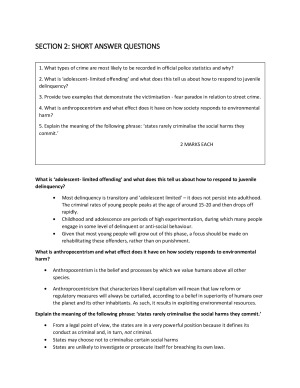 The following are template answers that I created in response to an exam briefing paper providing by the unit. The topics in this paper cover -White collar crime -Environmental crime -State Crime -Cyber Crime The answers provided here are the the product of content from the study guide, textbook chapters and lecture recordings. Relying solely on these notes for the exam, I was able to attain a HD grade. These notes will be most relevant for exam revision. The answers are in direct response to 3 sections that were provided in the briefing paper. Section 1 considered definitions of key terms Section 2 considered short answer questions Section 3 considered essay questions The questions on the briefing paper were almost identical to that provided on the briefing paper. So you can consider these responses as HD sample answers to a previous exam by this unit. Best of luck with your studies :)