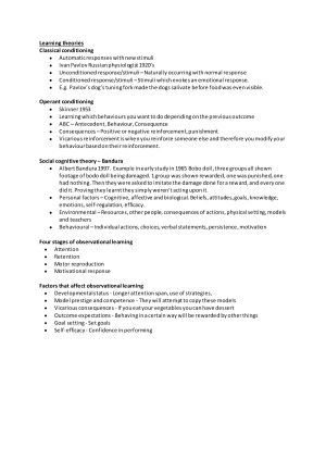 Notes of each of the topics covered in the semester, including: > Theories of human development > Physical Development > Social and Emotional Development > Learning Theories > Cognitive Development > Information processing, memory, perception, and attention > Intelligence and creativity Displayed in an easy to read format, with headings and subheadings explaining all the subtopics. The summary was collated from lecture notes, tutorial discussions, and the textbook Human Development. Also includes some graphics which assist in visual understanding.