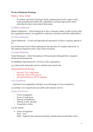 Comprehensive, thorough notes for every week from the first week to the last week (except weeks 6 & 7) that emphasises key points of every lecture and tutorial. The notes are coloured and very well-organised (makes for easy reading). They also include the necessary diagrams. I made these notes in the hope that they would help me prepare for the final exam. They did. I hope they will help you too, and hopefully, saves you a little bit of effort in studying for BUSS1001. *The notes are 69 pages.