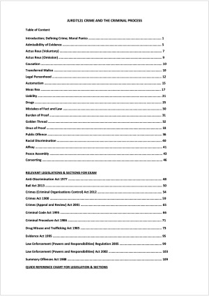 Study notes for JURD7121 Crime and the Criminal Process complete with all relevant legislation complied in one document for ease of use and studying. Also includes quick reference guide for sections in relevant legislations for quick reference in exam.