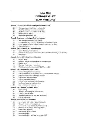 Complete exam notes for all topics in Employment Law. The notes are concise, well organised and structured around application to an exam scenario. Includes important case summaries. I have also included the notes I took into the exam for the policy section (Bullying / Sexual Harassment). These may be helpful for an assignment or if the exam has the same policy topics. The exam notes are 73 pages long (28,000 words). The policy notes are 14 pages long (5,000 words). Please see the sample for the contents as well as a sample from the topic 'Unfair Dismissal'.
