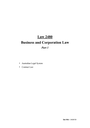 PART 1 Notes for RMIT LAW 2480 - Business and Corporation Law. I received a distinction in this subject with a 40% failure rate. Includes week 1-4 notes on THE AUSTRALIAN LEGAL SYSTEM AND CONTRACTS, Lecture AND textbook notes summarised. With case law/examples included. SEE PART 2 for notes covering week 5-12 on Corporation Law.