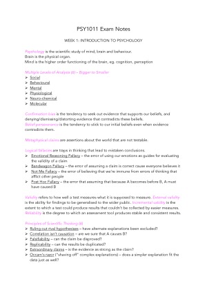My notes are a mixture of textbook and lecture content. All key terms are highlighted (with italics or underlines) as I find the PSY1011 exam is heavily based on the recognition and understanding of key terms. The notes are broken down week by week, with information summarised in tables and diagrams when necessary. I got an 85 in this subject by purely revising this content.
