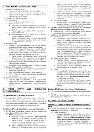 This is a complete yet very concise notes for Insurance Law. It will be extremely helpful to bring in to your final exams as it contains all the important cases (quick summary) as well as all the important legislations. Hope it helps! Good luck! :)