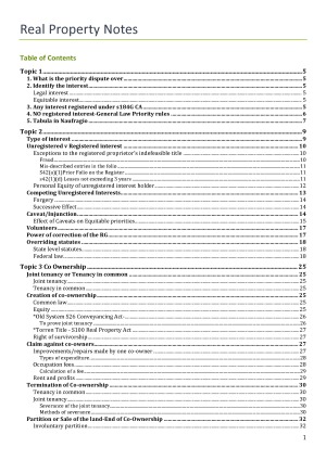 The notes provides a detailed account of the key materials covered in Real Property. They have been formatted to be extremely helpful to understand the course material and apply it to answer a problem question. Covers: Topic 1: Introduction Topic 2: Torrens Title Topic 3: Co-ownership; Rights of co-owners; severance; sale and partition Topic 4: Easements and Profits à Prendre Topic 5: Covenants over freehold land Topic 6: Leases and Licences Topic 7: Mortgages