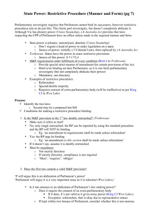 Comprehensive checklist that I used in the exam for Constitutional law. Provides exam structure and policy notes on the following topics: restrictive procedures, executive and legislative powers of cth, external affairs power, corporations power, race power, financial powers, implied intergovernmental immunities, separation of powers, implied political freedoms, freedom of interstate trade and inconsistency