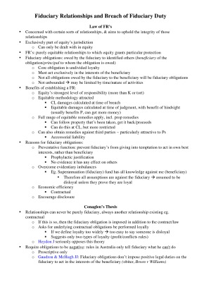 Detailed equity notes providing case summaries and extensive notes from readings and class on the following topics: fiduciary relationships, breach of fiduciary duty (defences and remedies), third party liability, breach of confidence, personal and proprietary remedies including tracing, and assignment of rights