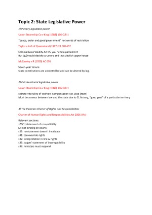 My exam summary notes for Consti, which helped me get a HD on the exam and a D overall (I stuffed up the assignment, oops...) Summaries of cases and principles, colour-coded Topic 1 not included as this was not really substantive/on the exam