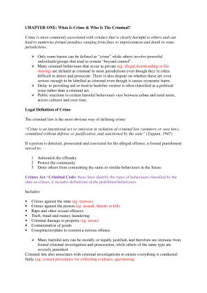 Notes were created utilising both textbook and lecture slides/notes. Topics include: - What is Crime & Who is the Criminal? - Measures of Crime - Explanations of Crime - Youth Crime - Crime in the Streets - Crime in the Home - White-Collar Crime - Environmental Crime - State Crime - Cybercrime