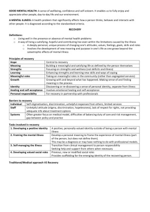 These are my personal notes covering all content from the unit made in preparation for the exam. Topics include: Mental Health Definitions Recovery (definitions, principles, barriers, tasks involved, approaches, OT role) Stigma The Mental State Examination (MSE) Mental Health Diagnosis Mental Health Act and Patient Rights Suicide/ Self-harm Psychosis Schizophrenia Bipolar Affective Disorder Depression Anxiety Disorders Assessment in Mental Health Intervention Using Online Tools Applying the CPPF