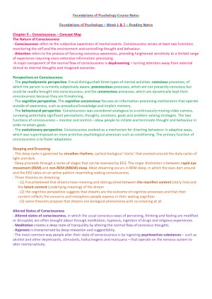 Course notes from the entire semester of PSYC1001 Foundations of Psychology. Includes notes from assigned readings, organised by week. Are 'colour-blocked' for ease of reading and studying. Also available in the following options: - Weeks 1 to 6 - Weeks 7 to 12 - Lecture and tutorial notes only - All (week 1 to 12, lecture, tutorial and reading notes). Received distinctions and high distinctions on all assessments and an overall mark of 84% in this unit.