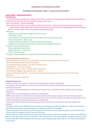 Course notes from the first six weeks of PSYC1001 Foundations of Psychology. Includes notes from lectures, tutorials, and assigned readings, organised by week. Are 'colour-blocked' for ease of reading and studying. Also available in the following options: - Weeks 7 to 12 - Lecture and tutorial notes only - Reading notes only - All (weeks 1 to 12, lecture, tutorial and reading notes). Received distinctions and high distinctions on all assessments and an overall mark of 84% in this unit.