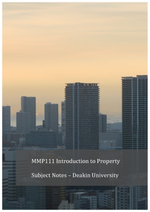 These carefully prepared notes for Deakin's MMP111 Introduction to Property should set you on your way to getting that HD! They helped me to achieve an HD exam and subject mark. Contains: Week 1 - Land Week 2 – Value Of Land Week 3 – Market Analys Week 4 – Three Valuation Approaches Week 5 – Value Influences Week 6 - Improvement Analysis Week 7 – Highest And Best Use Analysis Week 8 – Comparative Value Analysis Week 9 – Markets, Supply & Demand, Valuation Week 10 – Cost Approach