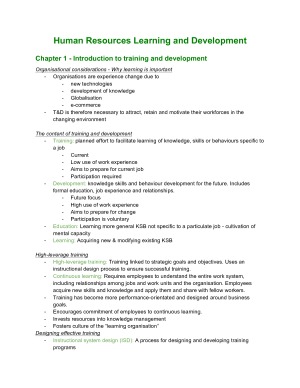 Notes written from lectures and textbook Contains: Chapter 1 - Introduction to training and development Chapter 2 - Strategic training and development Chapter 3 - Needs assessment Chapter 4 - Learning: theories and program design Chapter 5 - Transfer of training Chapter 6 - Training evaluation Chapter 8 - E-learning - SCP & MP Chapter 9 - Development Chapter 10 - Special issues in employee training and development Chapter 11 - Careers and career management