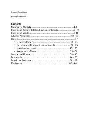 + These notes are succinct and concise yet comprehensive. + Topics covered: Adverse, Possession, Leases, Contractual Licenses, Easements, Restrictive Covenants and Mortgages + Summaries, Relevant Tests, Case Summaries, Application of case principles