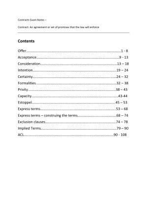 + These notes are succinct and concise yet comprehensive. + Topics covered: Offer, Acceptance, Consideration, Intention, Certainty, Formalities, Privity, Capacity, Estoppel, Express Terms: Construing the terms, Parol Evidence Rule, Exclusion Clauses, Implied Terms, Australian Consumer Law + Summaries, Relevant Tests, Case Summaries, Application of case principles