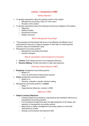 Extensive Management Decisions and Control notes compiled from both the textbook and lecture slides that allowed me to get a HD in this subject. Topics covered within these notes include: - Introduction to MDC - Introduction to Performance Measurement - Financial Performance Measurement - Non-Financial Performance Measurement - Integrated Performance Management - Planning - Motivating Behaviour - Performance Evaluation and Feedback - Information for Decision Making - Making Better Decisions - Management Accounting Systems in Context