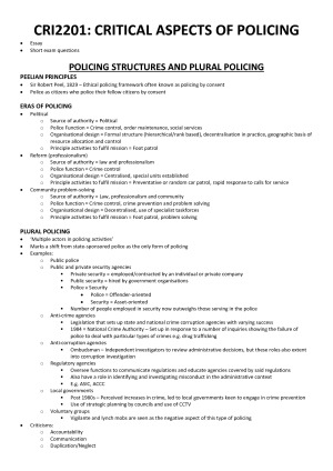 CRI2201: Critical Aspects of Policing Exam Notes Includes overview of each topic. Topics include: 1. Policing Structures & Plural Policing; 2. Dimensions of Policing Strategies/Policing Models; 3. Problem-oriented and Intelligence Led Policing; 4. Evidence Based Policing; 5. Police Powers and Discretion; 6. Gender and Policing; 7. Police Stress Care; 8. Policing Minority Groups; 9. Policing People with a Mental Illness; 10. Family and Domestic Violence; and 11. Policing and Forensic Science. Content as at Semester 2, 2016.