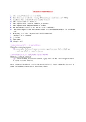 - A complete set of final exam notes. - Clear guide to answering problem questions. - Includes relevant and concise case summaries. - 49 pages of full colour - Topics include: Deceptive Trade Practices Establishing the cause of action Assessment of damages Equitable remedies Restitution Note: the sample shows the first few pages of each topic included.