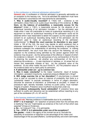 Summary "cheat sheets" for exam problem questions in relation to specific issues of hearsay evidence, character evidence, opinion evidence and confessions/informal admissions.