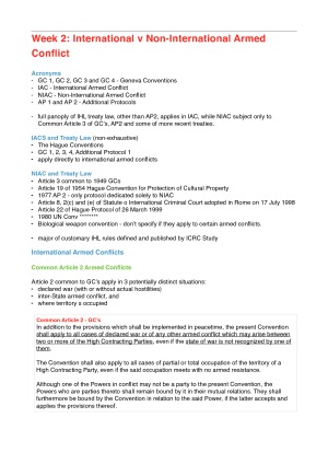 Summary of war law textbook, lectures and tute notes compiled into one easy to read document! Covers everything up to week 9.