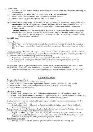 Notes to assist throughout the semester and for the final exam (Week 1 -12) condensed into 6 pages Contains: - 1.1 Foreign Exchange Markets - 1.2 Bond Markets - 1.3 Equity Trading