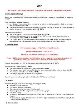 These are my exam notes for Tax Law which I completed in Semester 1, 2017. They contain the structures for answering questions, formulas, case examples and general exam advice. Hope they help!