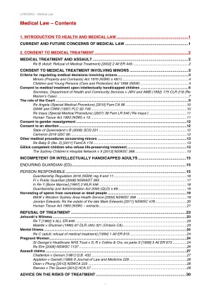 Comprehensive notes on legislation, cases and principles of Medical Law. Contains contents page with clear structure in accordance to the Unit of Study Outline.