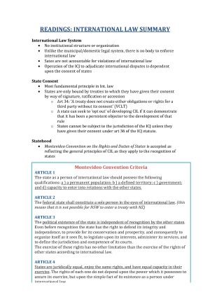 Summary for International Law LAWS2250 with readings content- Also provides samples of the Articles. Useful for the exams- HD responses.