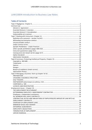 This set of notes includes summaries of weeks 5-12, and has everything you will need to know to ace the exam. Easy to navigate with a table of contents and headings, this will save you precious time spent flicking through your textbook. Footnotes link to all cases in the text book (Business Law, 4th Ed. Nikolas James) with page numbers of cases that are summarised.