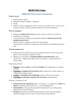 These notes are based on the lectures and tutorials from all weeks and the textbook. They are detailed and cover all areas of MGMT1001 with diagrams and pictures included.