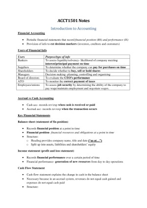 These notes are based on the lectures and tutorials from all weeks and the textbook. They are detailed and cover all areas of ACCT1501 with diagrams and graphs included.