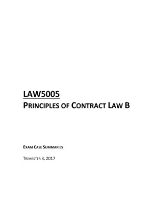 Case summaries created in Trimester 3 2017 for LAW5005 Contracts B (Monash JD). These summaries are designed to give a clear outline of critical facts, what was held, the rationale of the decision and the key legal principle established. They also note the court, legal citation, and the name of the judge(s) involved in the decision. These Notes Include Cases on: -Termination -Remedies for Breach -Frustration -Common Law Vitiating Factors -Statutory Vitiating Factors Note: For the best preview of the notes, view the 'preview' on a non-mobile device. Disclaimer: The accuracy of these notes is not guaranteed