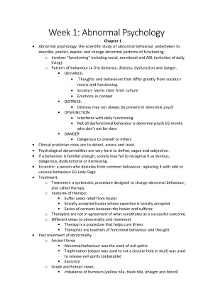 A HUGE collection of notes, over 100 pages! Notes include content from both the textbook and lectures. Content covers all weeks and includes: anxiety and stress, mood disorders, psychotic disorders, classification and diagnosis and personality disorders, as well as many more. Textbook used: Abnormal Psychology by Cormer, 2015.