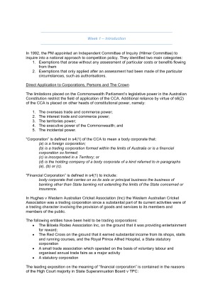 Notes used to achieve 87 in the course for Consumer and Competition Law. Easy to understand - incorporate lecture slides, readings. Contains: Week 1 – Introduction Week 2 – Fundamental Competition Concepts Week 3 – Cartel Regulation Week 5 – Misuse of Market Power Week 6 – Mergers Week 7 – Consumer Protection Regulation Week 8 – Misleading or Deceptive Conduct Week 9 – Manufacturers Liability Week 10 – Unconscionable Conduct Week 11 – Unfair Contract Terms Week 12 – Remedies & Enforcement
