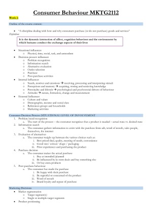 Complete Notes (Pre & After Mid-Sem) gives students a great chance to understand the content necessary not only to ace the FINAL EXAM/ASSIGNMENT, but also a greater appreciation to the role of marketing and the interaction of consumers/marketers behaviour in the business world. All key points are labelled in subheadings, which emphasises the key points discussed in each lecture! Good luck fellas!