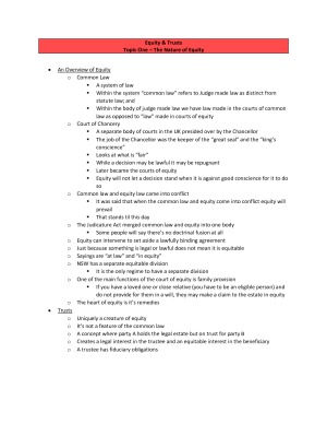 Extensive and details notes from Equity & Trusts T1 2017 Final Grade - Distinction Topics Covered: - The Nature of Equit - Equitable Interests: Their Nature and Creation/Equitable Priorities - Assignment of Property in Equity - Relationships of Trust: Fiduciaries and Confidential Information - Unconscionable Conduct and Unfair Outcomes - Trusts: Their Nature and Modern Functions - Express & Discretionary Trusts - Charitable and Purpose Trusts - Resulting and Constructive Trusts - Trustees and Beneficiaries: Rights and Obligations - Equitable Remedies