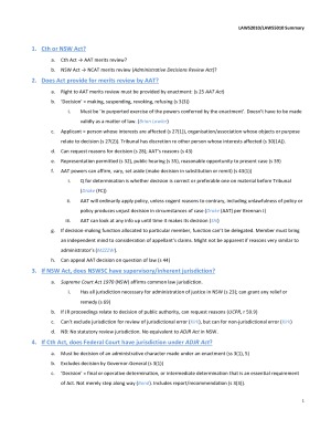 This set of notes provides a detailed yet concise summary of the content needed for the Administrative Law courses taught at the University of Sydney (LAWS2010 and LAWS5010). I would recommend using these notes (which are about 9 pages) with a more comprehensive set of notes in case you require further information on a principle or case mentioned. I will upload a more detailed set of notes (which can accompany these notes if you wish) shortly. These notes are perfect for the open book exam where you won't have time to go through a 45+ page set of notes. I solely referred to these notes during my exam, and achieved a mark of 84. Please feel free to contact me via StudentVIP if you have any questions.