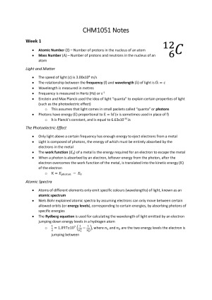 These notes cover all 12 weeks of CHM1051 (and are also useful for CHM1011). The notes cover all the topics in order, with important information and terminology highlighted. These notes cover: - Atomic and molecular orbitals - Molecular bonding - Gases and intermolecular bonding - Thermodynamics - Chemical Equilibria - Acids and Bases - Reaction Kinetics
